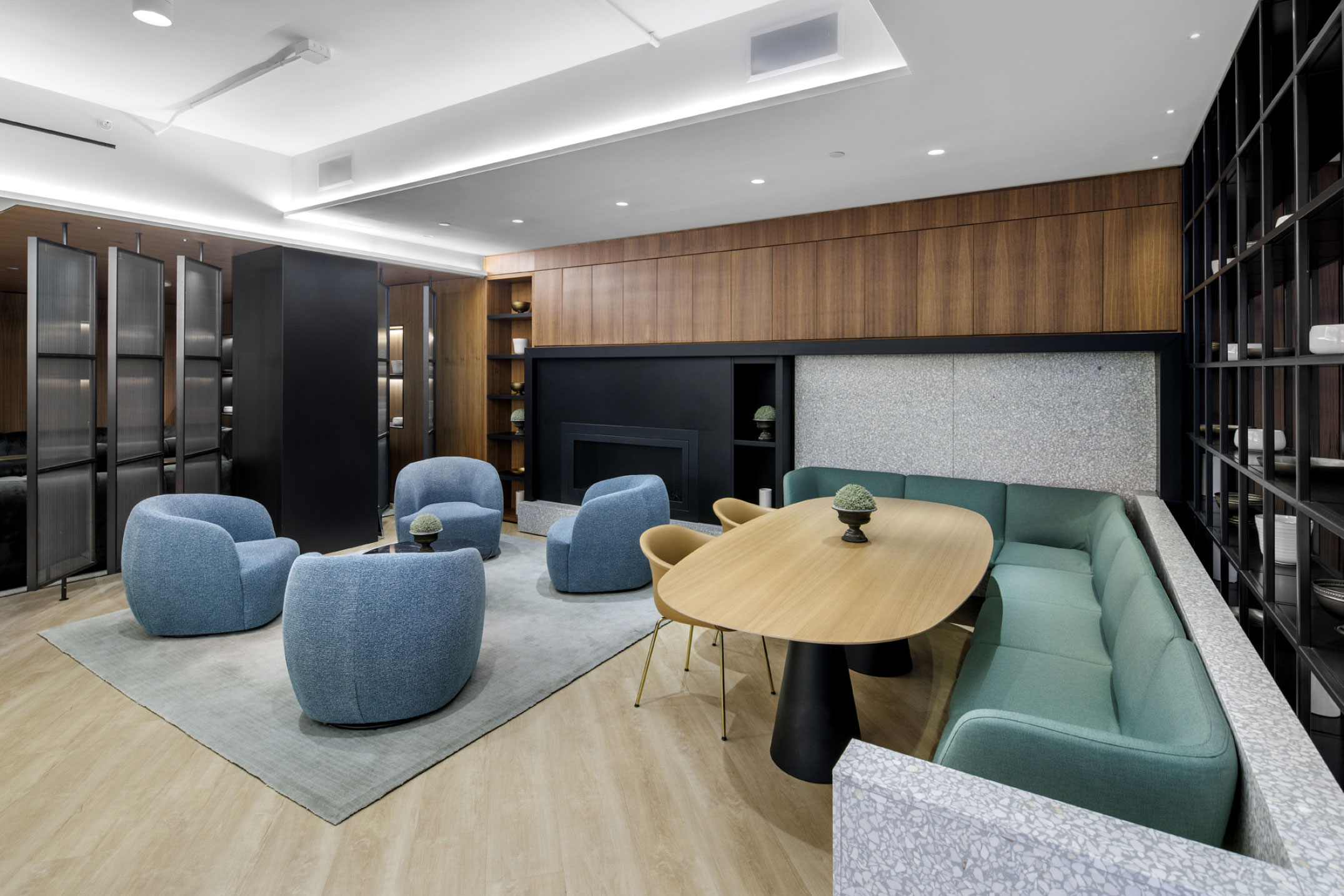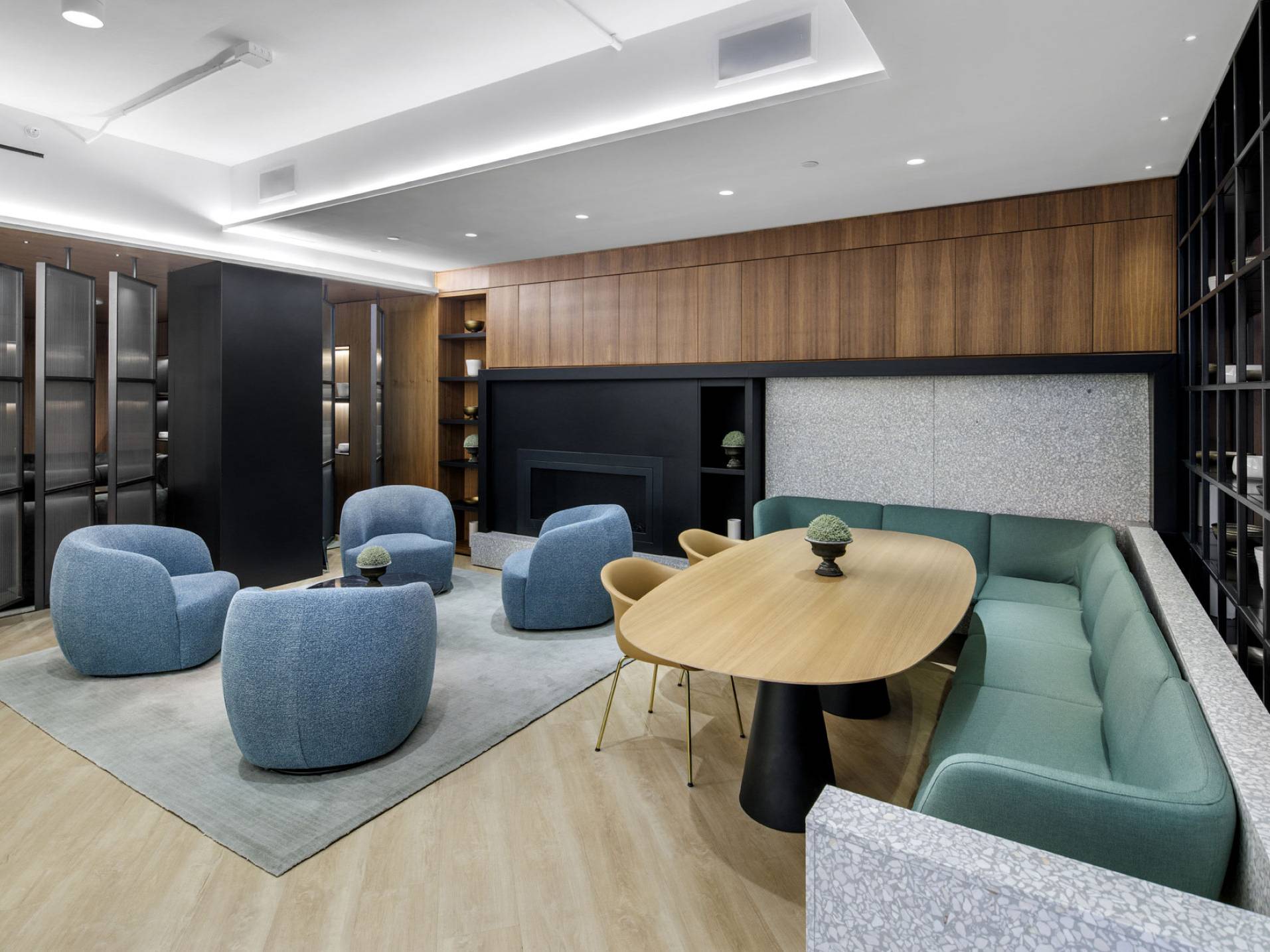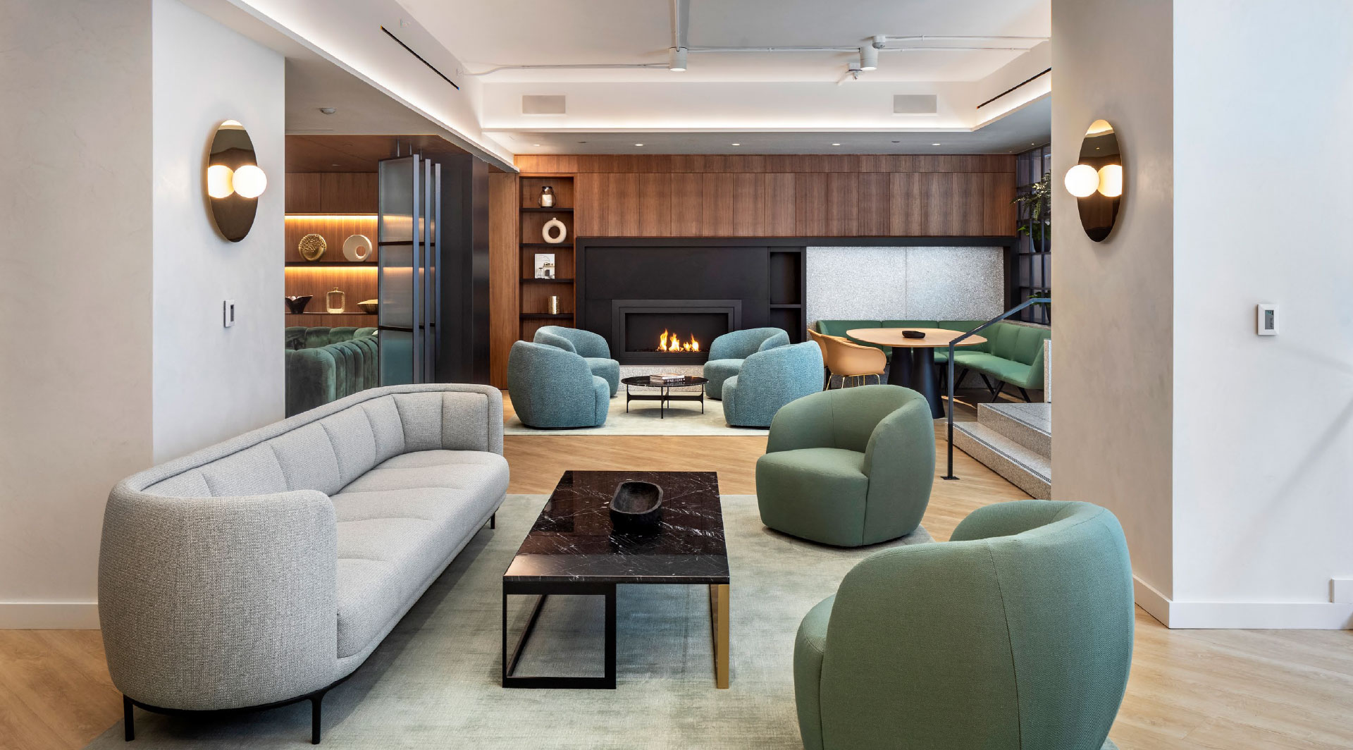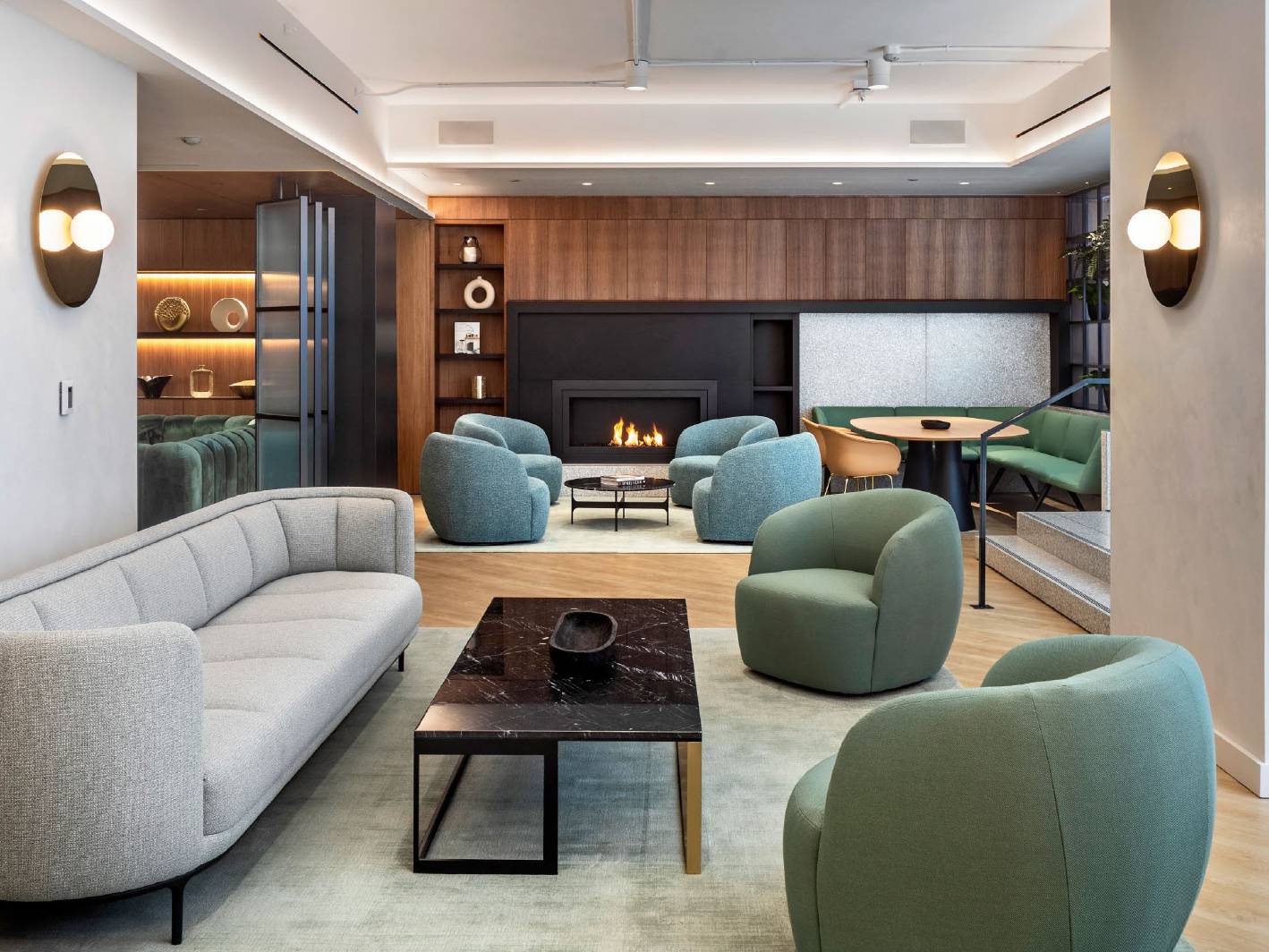 Work lounge with fireplace Outdoor terrace Private phone booths Cafe and bar area Yoga and wellness room